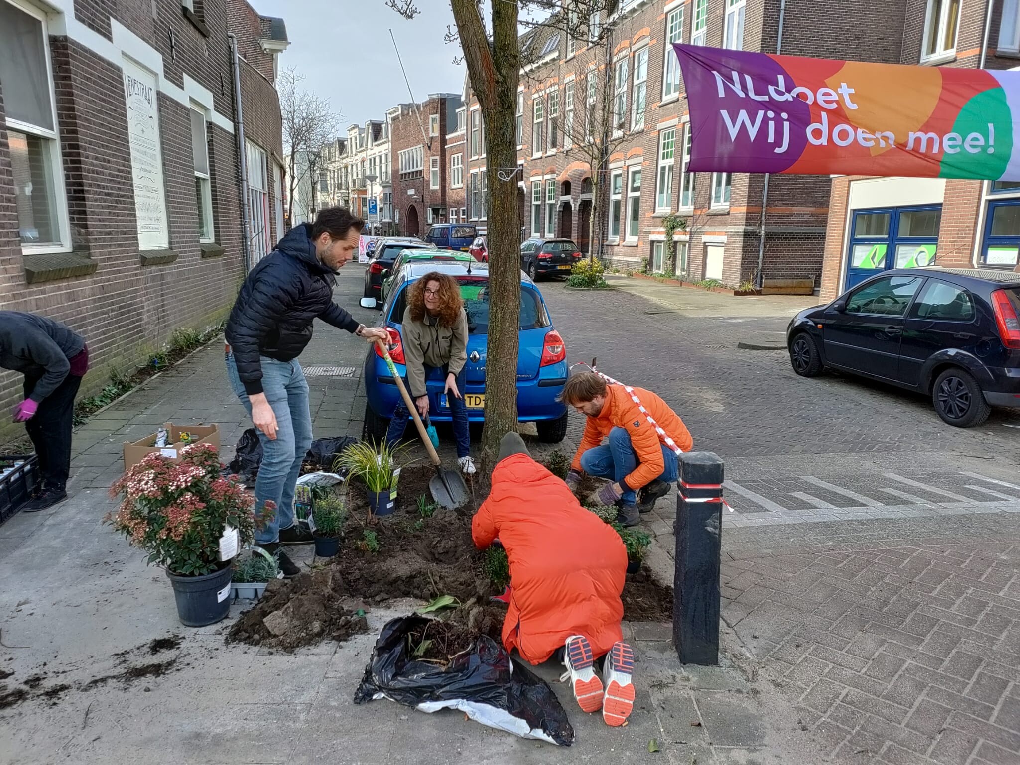 ‘Wij hebben een zeer geslaagde ochtend gehad op onze burendag’, aldus bewoners Annette Bos en Mira Benes. We hebben planten en bollen geplant langs de bomen en in nieuwe groenvakken, de straat opgeruimd en uiteraard gezellig koffie gedronken.’