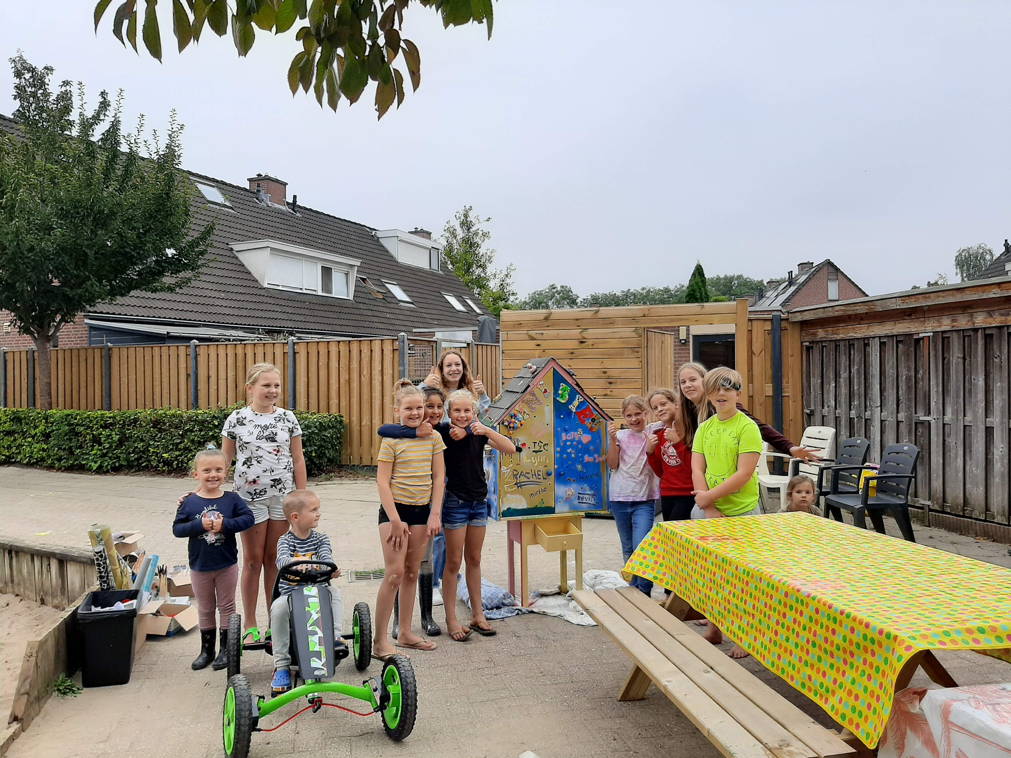 ‘Toen Stijntje de buurt optrommelde om te bespreken wat we met de zandbak en uiteindelijk het hele pleintje konden doen, vond ik dat een leuk idee. Ik woonde nog maar net in de wijk en vond het leuk om zo de buren beter te leren kennen. Ik wierp me op als organisator van het maken van een minibieb met de buurtkinderen. Mijn vriend timmerde de bieb van gerecycled hout, ik zorgde voor knutselmateriaal en de kinderen gingen los met het verven en pimpen van het biebje.’