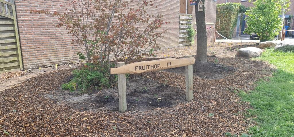 De bewoners en kinderen gingen wederom op Burendag een jaar later aan de slag. Peter: ‘We kozen voor de naam Fruithof, maar we hebben ook bloemen gezaaid. Natuurlijk mochten de kruiden ook niet ontbreken. En de kinderen maakten vogelhuisjes en een bijenhotel.’