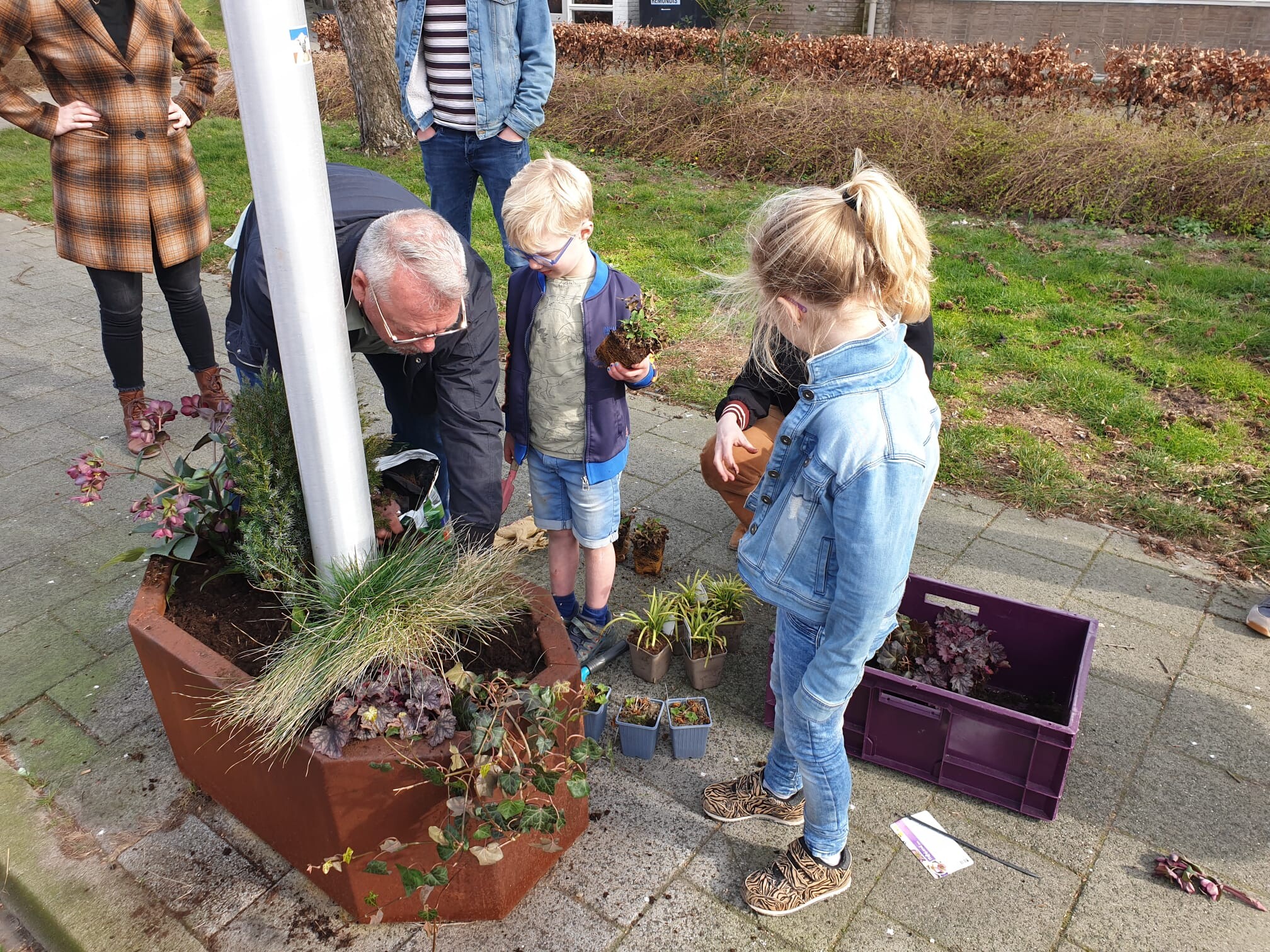 Tsjebbe: ‘We kozen voor een zeskantige bak. Die heeft geen scherpe randen. Dus dat is veiliger voor voorbijgangers. We hebben twee tuintjes gemaakt. Met de gemeente hebben we afgesproken dat we het onderhoud zelf doen net als van de hangbakken. Die afspraak is geen enkel probleem, want dit initiatief wordt breed gedragen door meerdere bewoners uit onze straat.’