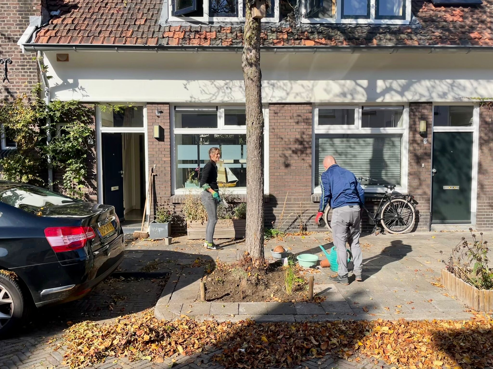 Heather: ‘De grond om de bomen was verhoogd, waardoor het regenwater wegstroomde. En we hadden geen afspraken gemaakt over het onderhoud.’ Janine: ‘Die wilden we verlagen en opnieuw inrichten. Een aantal buren wilde de straat nog meer vergroenen en hierbij ook verduurzaming en onderhoud meenemen. Aan een kant van de straat is de stoep zo breed dat er ruimte genoeg was voor plantvakken. Heather: ‘Dat hadden we gezien in omliggende straten.’