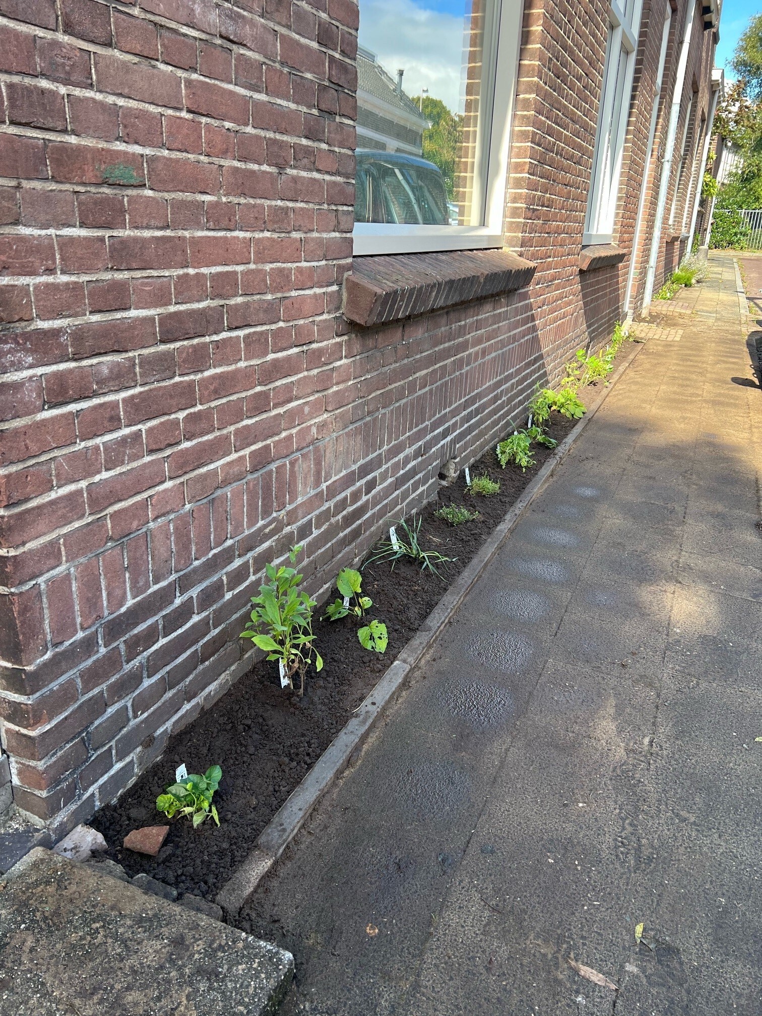 Jackie: “’Een deel van de bewoners had al een geveltuintje, maar aan de oneven kant was dit nog niet gerealiseerd. Ik deed een oproepje in de appgroep van de Sallandstraat en dat leverde voldoende reacties op om aan de slag te gaan. Ook buren die zelf geen geveltuintje wilden deden mee’’. Dirk Pieter zorgde voor de juiste planten en het contact met de gemeente en Jackie voor de materialen zoals opsluitbandjes en kruiwagens. De kosten voor de planten en de materialen werden vergoed door bijdragen van het Oranjefonds en Premie op Actie van de gemeente.