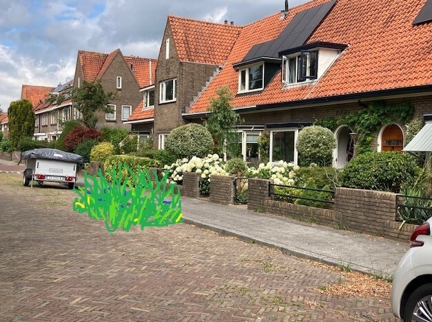 Mijn idee is om de parkeerplaats vóór mijn huis te veranderen in een stukje groen/perkje/tuintje. Bijvoorbeeld zoals men gedaan heeft op de kruising Papaverstraat/Molenweg(zie foto's)