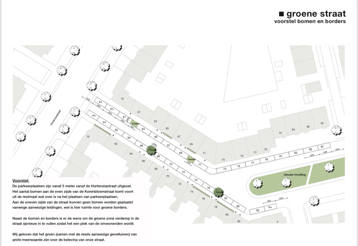 Het afgelopen jaar hebben wij - een aantal enthousiaste buren in de Korenbloemstraat - nagedacht over het vergroenen van de straat. Het is tijd voor een straatbeeld die past bij deze tijd. Want wie wil nou geen groen in de wijk? En voldoende ruimte voor ontspanning en om elkaar te ontmoeten?