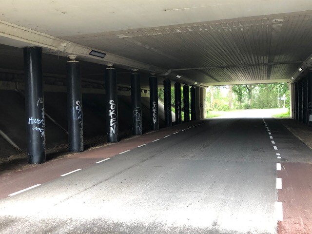 De toegangspoort van de Bergkloosterweg, het A-28 viaduct, is ons een doorn in het oog. Onveilig, beklad, kapotte verlichting, brandschade, urinoir, geen voetgangerspad, rommelig en ga zo maar door.