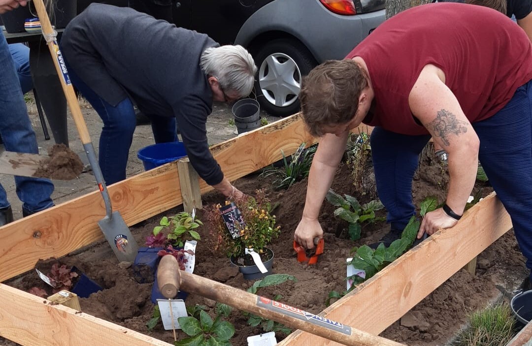 De bewoners kwamen met nog meer ideeën voor de buurt. Ideeën die makkelijker en sneller te realiseren zijn. Diny: ‘Op Burendag hebben we de tegels om de bomen in de straat weggehaald. Daaromheen zijn houten bakken gemaakt die we hebben gevuld met planten.’