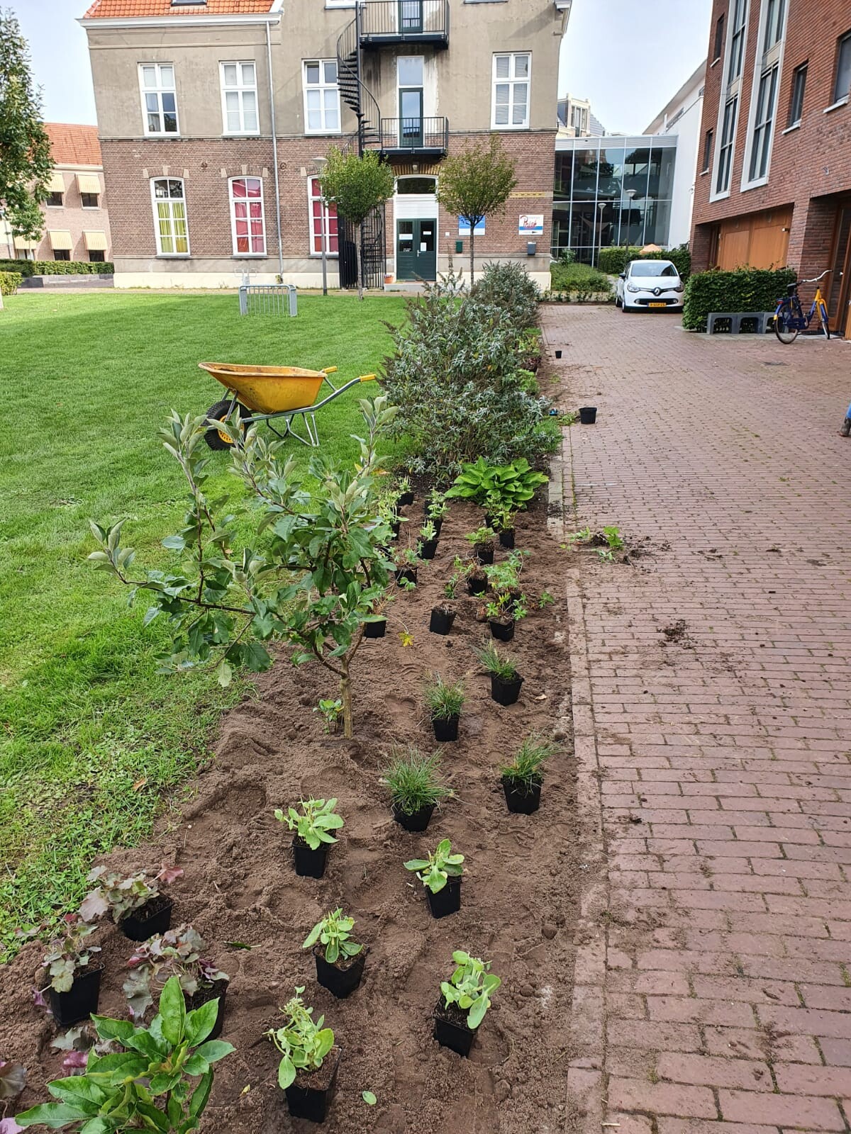 In de zomer van 2020 hebben we een moestuinbak op 'ons' openbare grasveld/gezamenlijke voortuin geplaatst. Behalve de eerste groenten trok het vak ook veel bekijks van buren. De groenstroken langs hetzelfde grasveld konden ook wel een upgrade gebruiken omdat de beplanting niet goed aansloeg. We namen contact op met de gemeente om het te 'adopteren', maakten vervolgens een beplantingsplan en verbeterden de grond. Rova haalde de oude grond op en bracht verse aarde. Met burendag hebben we de planten ingeplant en bloembollen gepoot. Het ziet er nu al gezelliger uit en we kijken uit naar het resultaat volgend jaar.