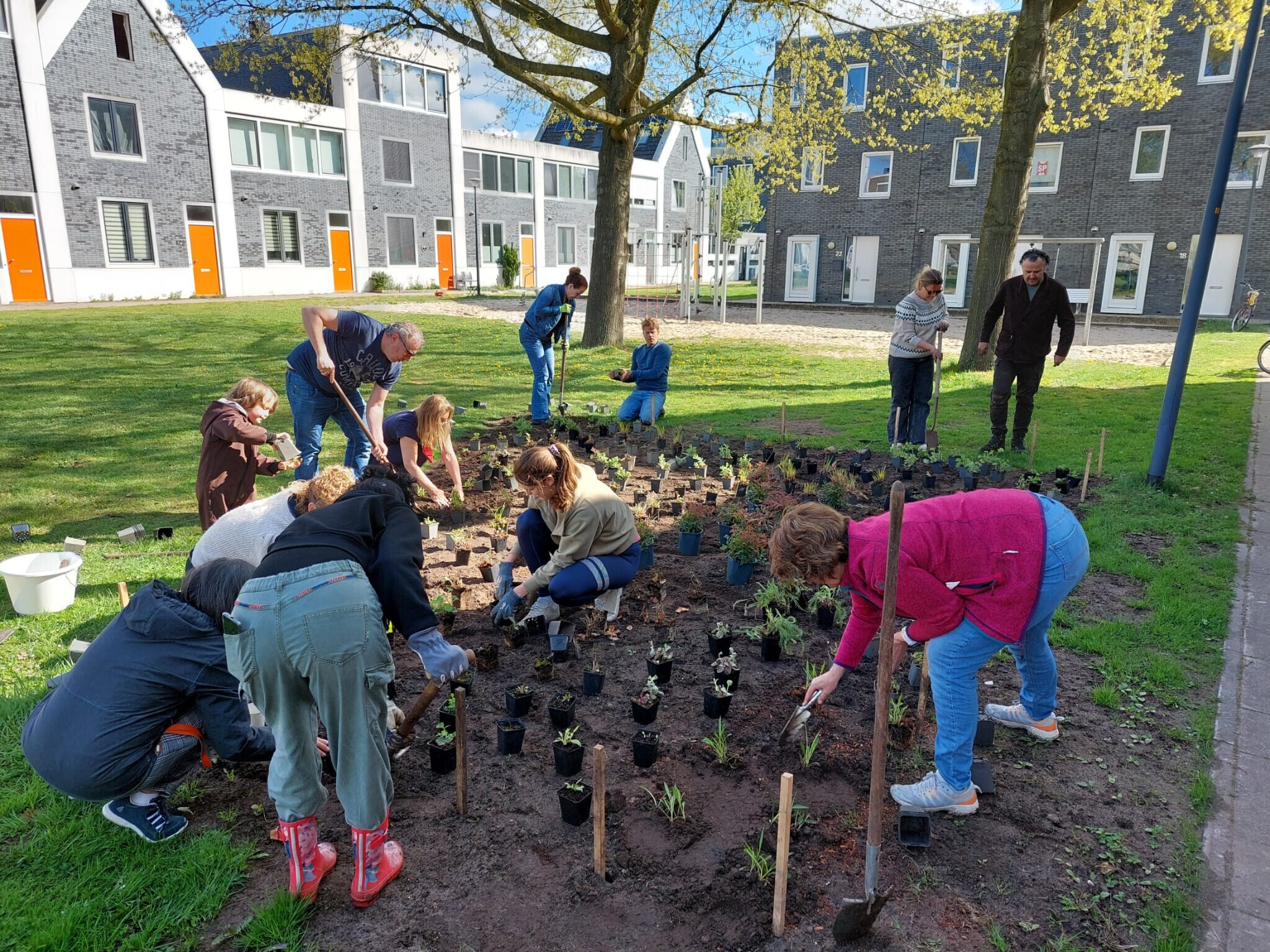 Samen met Andrea Freund, groenadviseur bij de gemeente, werd een definitief ontwerp gemaakt dat steeds werd getoetst met de buren. Hierbij werd zoveel mogelijk rekening gehouden met ieders wensen. De zaterdag dat de buurtbewoners de plantvakken gingen vullen, was erg gezellig. Een buurvrouw bakte een cake, een ander zorgde voor koffie en thee. ‘Het was supergezellig. Er zijn contacten ontstaan die er eerder niet waren’, leggen de buurvrouwen uit. Het veld heeft nu een naast gemeentelijk groen ook adoptietuintjes. Deze plantvakken worden een keer in de twee weken door de bewoners onderhouden. Er staat nu alleen nog een waterpomp en een klimboom op het wensenlijstje.