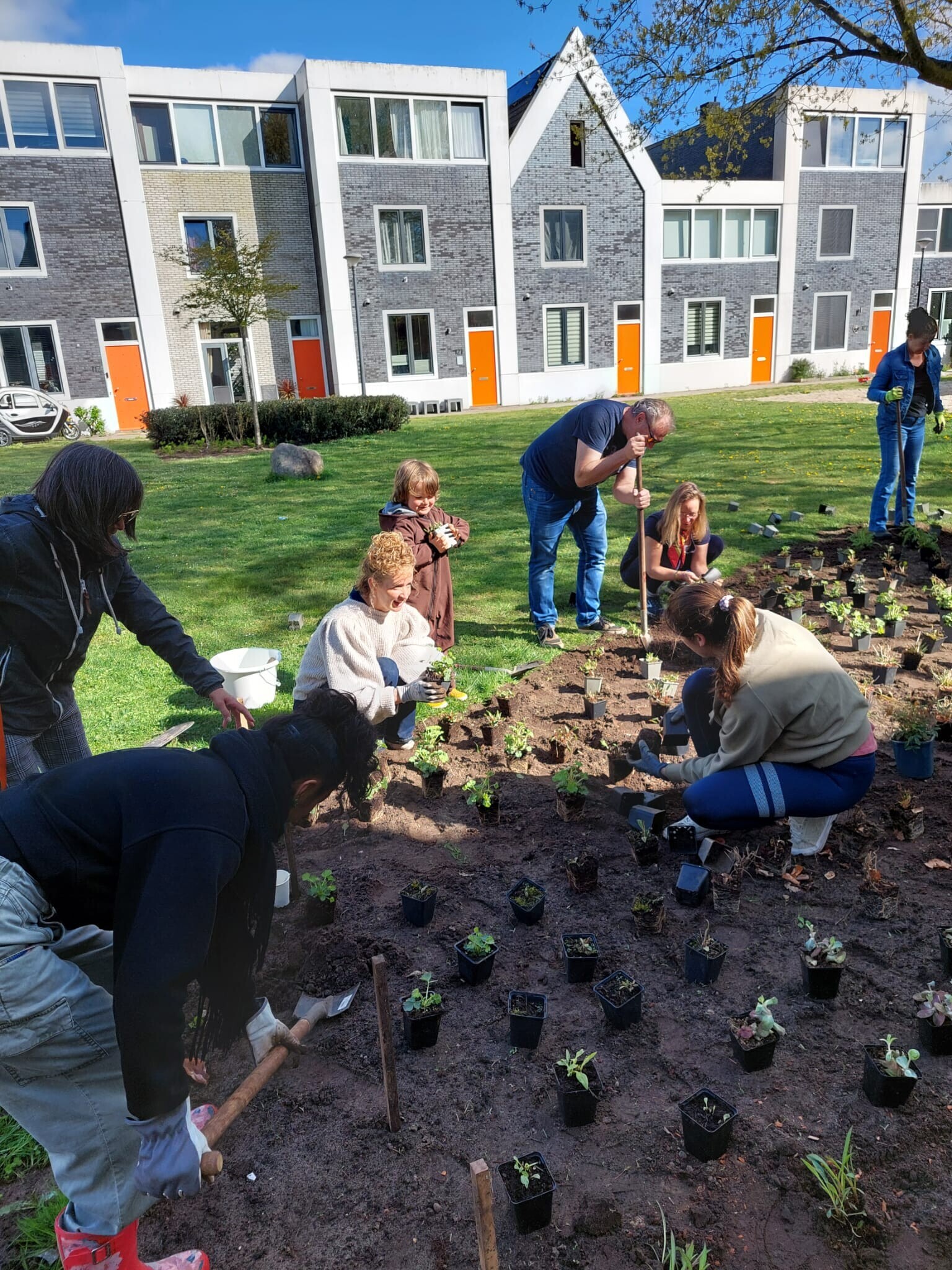 Samen met Andrea Freund, groenadviseur bij de gemeente, werd een definitief ontwerp gemaakt dat steeds werd getoetst met de buren. Hierbij werd zoveel mogelijk rekening gehouden met ieders wensen. De zaterdag dat de buurtbewoners de plantvakken gingen vullen, was erg gezellig. Een buurvrouw bakte een cake, een ander zorgde voor koffie en thee. ‘Het was supergezellig. Er zijn contacten ontstaan die er eerder niet waren’, leggen de buurvrouwen uit. Het veld heeft nu een naast gemeentelijk groen ook adoptietuintjes. Deze plantvakken worden een keer in de twee weken door de bewoners onderhouden. Er staat nu alleen nog een waterpomp en een klimboom op het wensenlijstje.