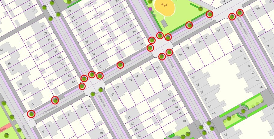 rondom de bomen aan de klompestraat boomtuintjes realiseren.