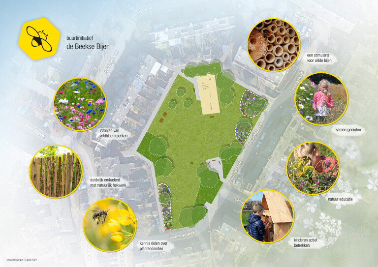 Maar ook in de openbare ruimte kunnen we het verschil maken. Omdat we op het speelveld tussen de Lovink- en Leerinkbeek al een insectenhotel hebben staan voor de bijen, dachten we dat het goed zou zijn onze gasten van een goede maaltijd te voorzien. Dat zou kunnen door een deel van het speelveld te beplanten en in te zaaien met bloemen. We hebben in een schets al neergezet hoe dat eventueel zou kunnen.