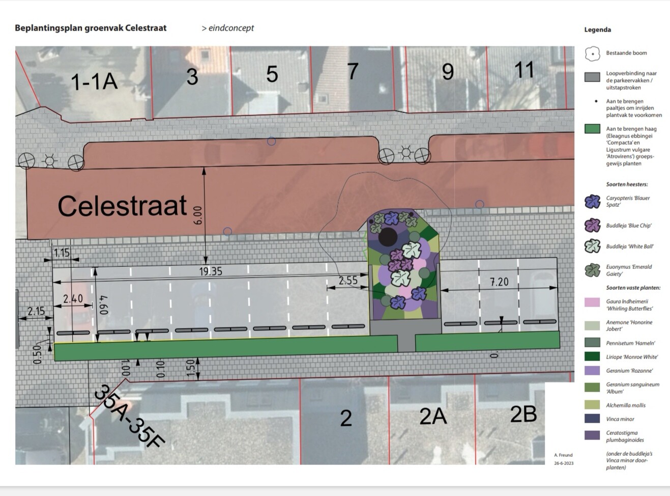 De rest van de parkeervakken rondom de boom wordt verplaatst en opnieuw bestraat. Tussen de woningen en de parkeervakken komt een haag. Achter en om de boom wordt een variatie aan vaste planten en heesters geplant, die de buurtbewoners met plezier adopteren en onderhouden.