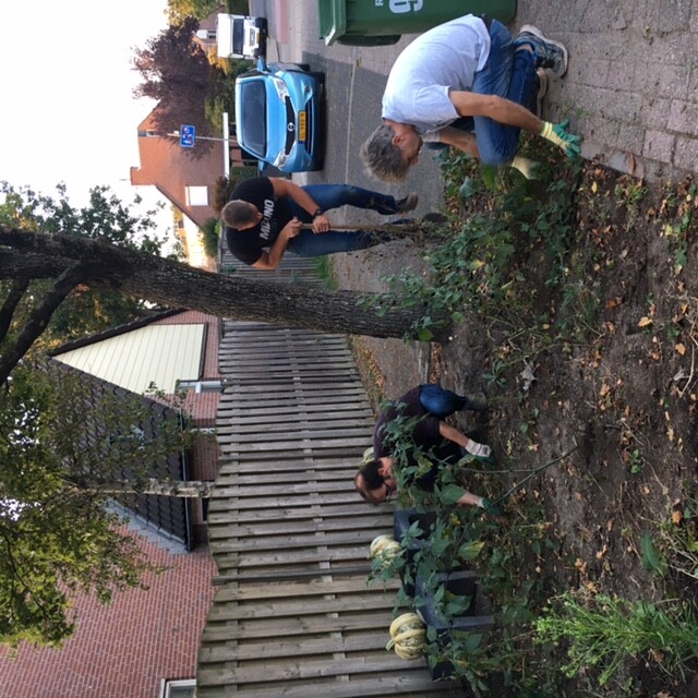 In de Knoopkruidweg hebben we in het voorjaar van 2021 de oprit van de straat vergroend. Langs de schuttingen en in een dooie hoek hebben we de stenen gelicht en er bloemen en struiken in geplant; kiwibessen, zonnehoedjes, stokrozen, zonnebloemen en pompoenen en bosaardbeitjes voor de kinderen. Binnenkort gaan we de eerste soep koken van de pompoenen! .