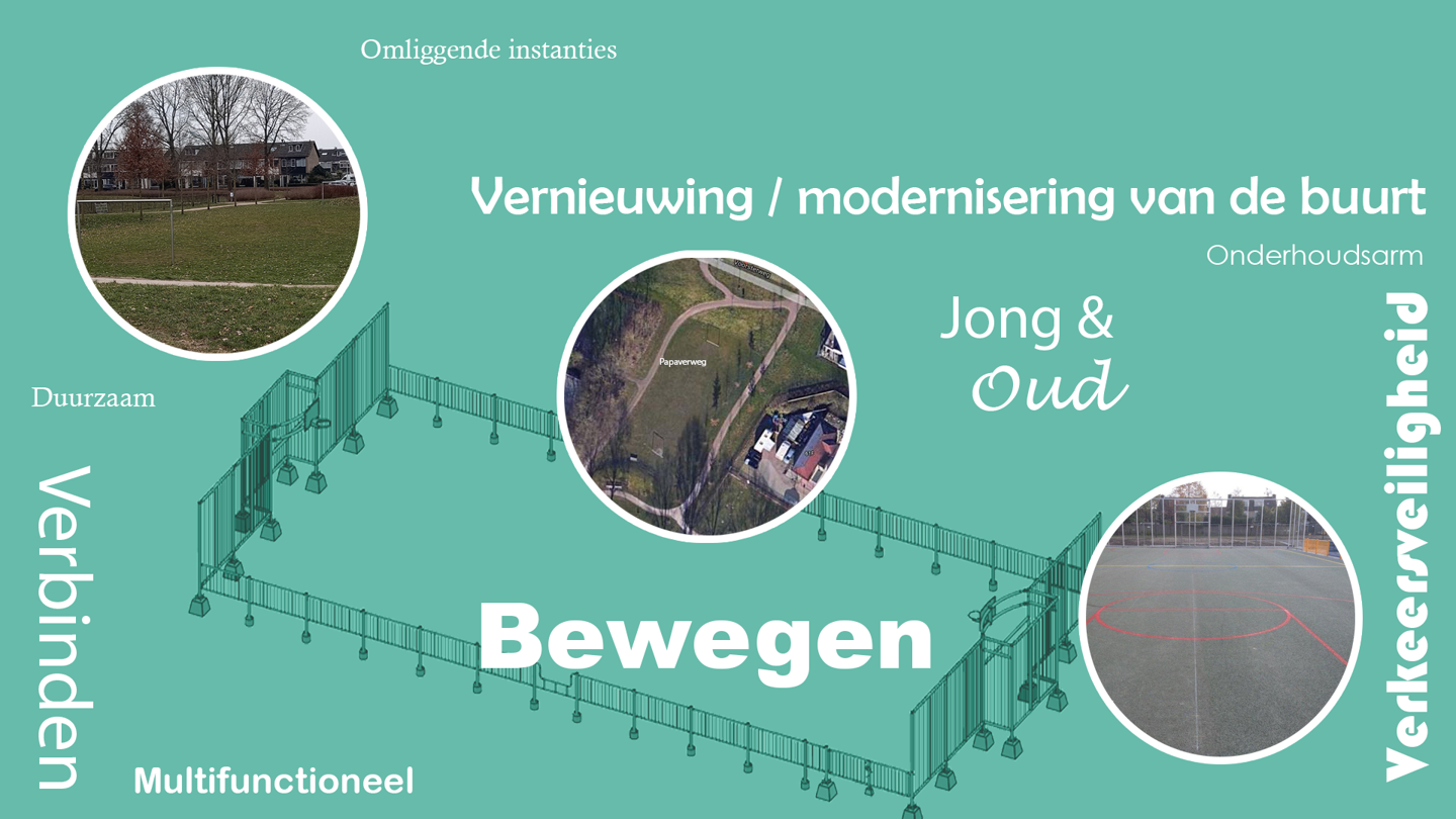 We willen een gevarieerde, aantrekkelijke, onderhoudsvriendelijke en multifunctioneel sportveld realiseren waar jong en oud kunnen sporten en elkaar ontmoeten. Het multifunctioneel sportveld dient onderhoudsvrij en geluidsarm te zijn met de mogelijkheid om bijvoorbeeld te voetballen, basketballen en eventueel andere activiteiten