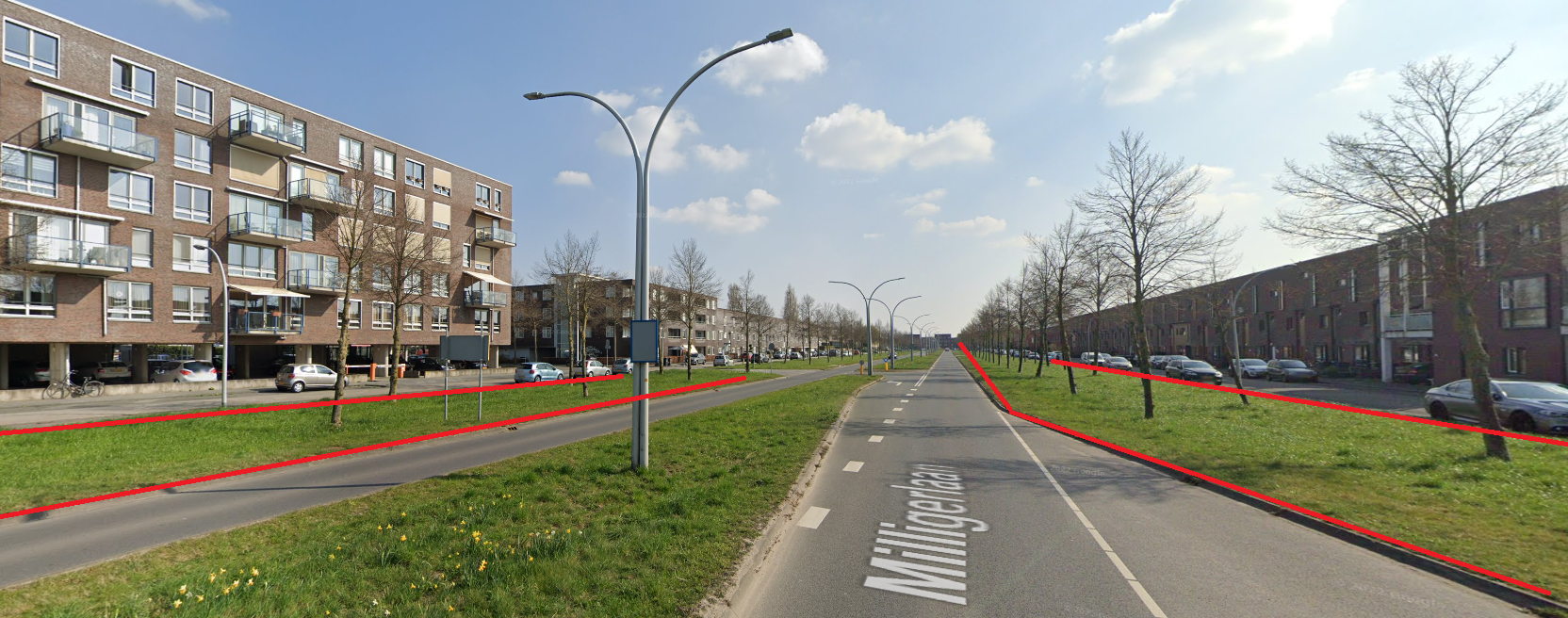 Het zijn enorme lappen grond met niks dan gras en wat bomen, en dat terwijl het vol op de route ligt naar scholen en sportactiviteiten etcetera. Hier moet toch iets leuks mee te doen zijn. Kan simpel in de vorm van plaatsing speeltoestellen en wat bankjes, maar het kan ook grootser aangepakt in de vorm van bijvoorbeeld een soort stormbaan? Wat leuke beplanting? Ruimte zat! Uiteraard moet er dan wel een hek komen aan de kant van de Milligerweg, niet de bedoeling dat men daar zo de drukke weg op kan schieten!