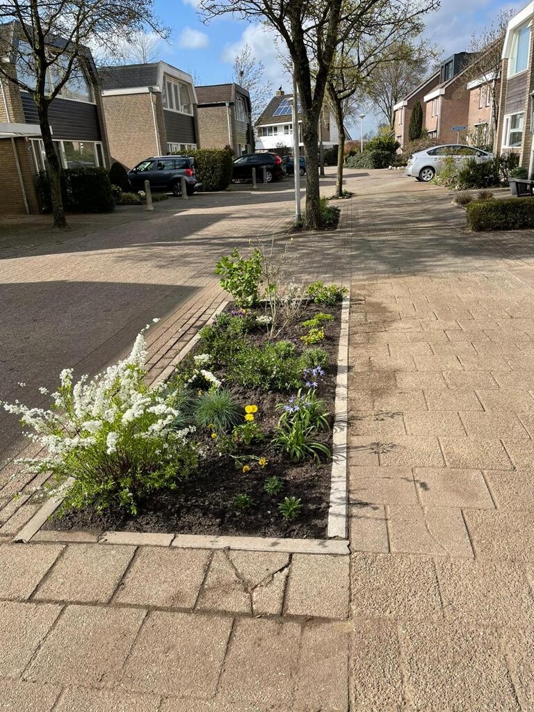 Het idee is dan ook om stenen, welke eigenlijk geen functionele waarde hebben dan alleen de verbinding tussen de rijbaan en het trotoir te vervangen door 3 groenperkjes. Deze stenen slaan in de winterperiode groen uit door alg, niemand die het gebruikt. Groenperkjes die wij als bewoners graag willen onderhouden als onze eigen voortuin.