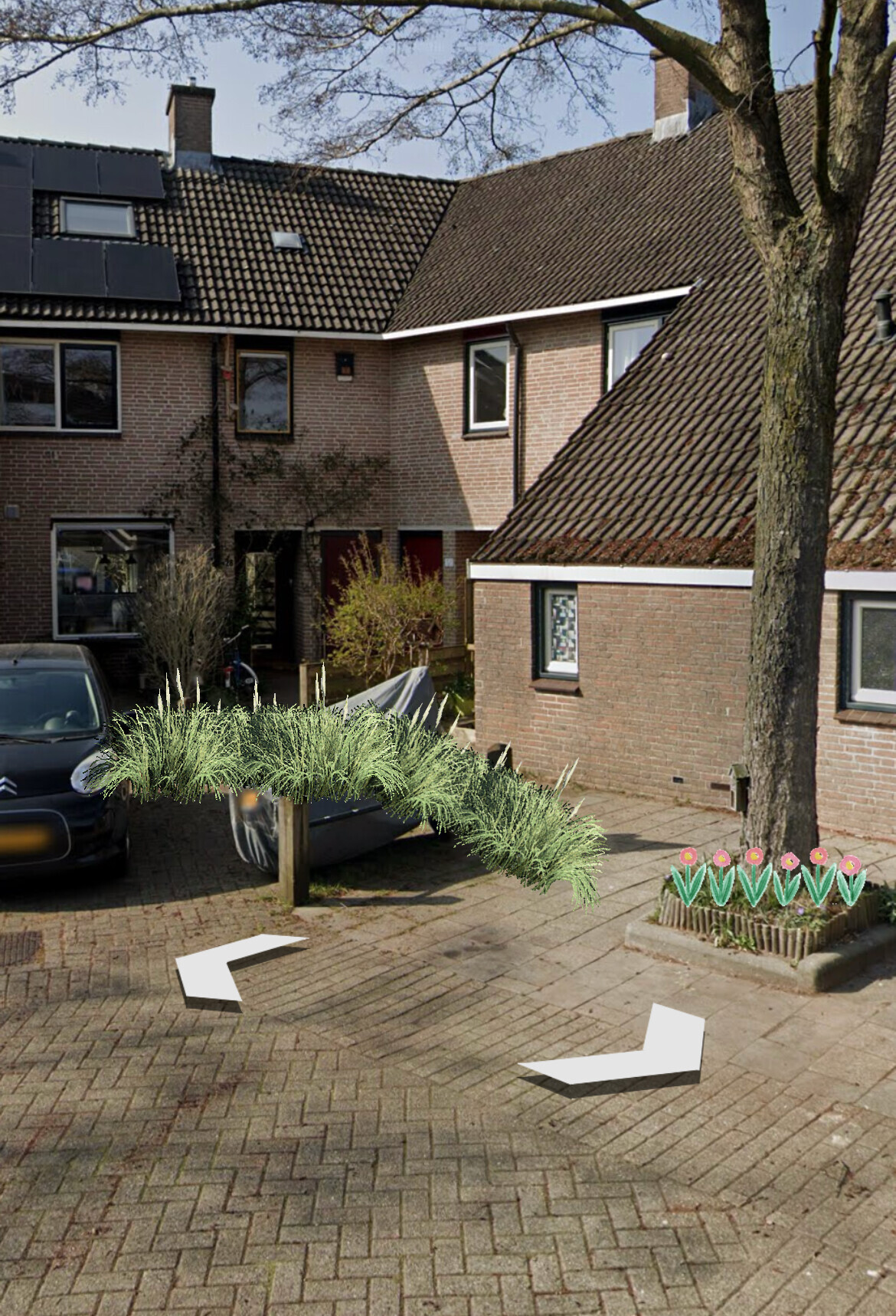 Het plan is om de houten palen en de stalen buizen die nu als afbakening van de parkeerplaatsen fungeren te vervangen voor groenstroken. Deze groenstroken dienen wij met de buurt te bepalen aangezien hier veel mogelijkheden in zijn met zo hun voor- en nadelen per groenstrook. Op deze manier maken we de buurt milieuvriendelijker, groener en fraaier.