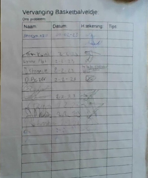 Wij hebben in de buurt een basketbal veldje die nodig aan vervanging toe.Daarom willen we nieuwe asfalt, lijnen en verlichting anders kan je niet zo lang basketballen en in de avond is dat heel leuk maar dat onveilig vinden we.We hebben ook in de buurt handtekeningen gevraagt het zijn er 60.