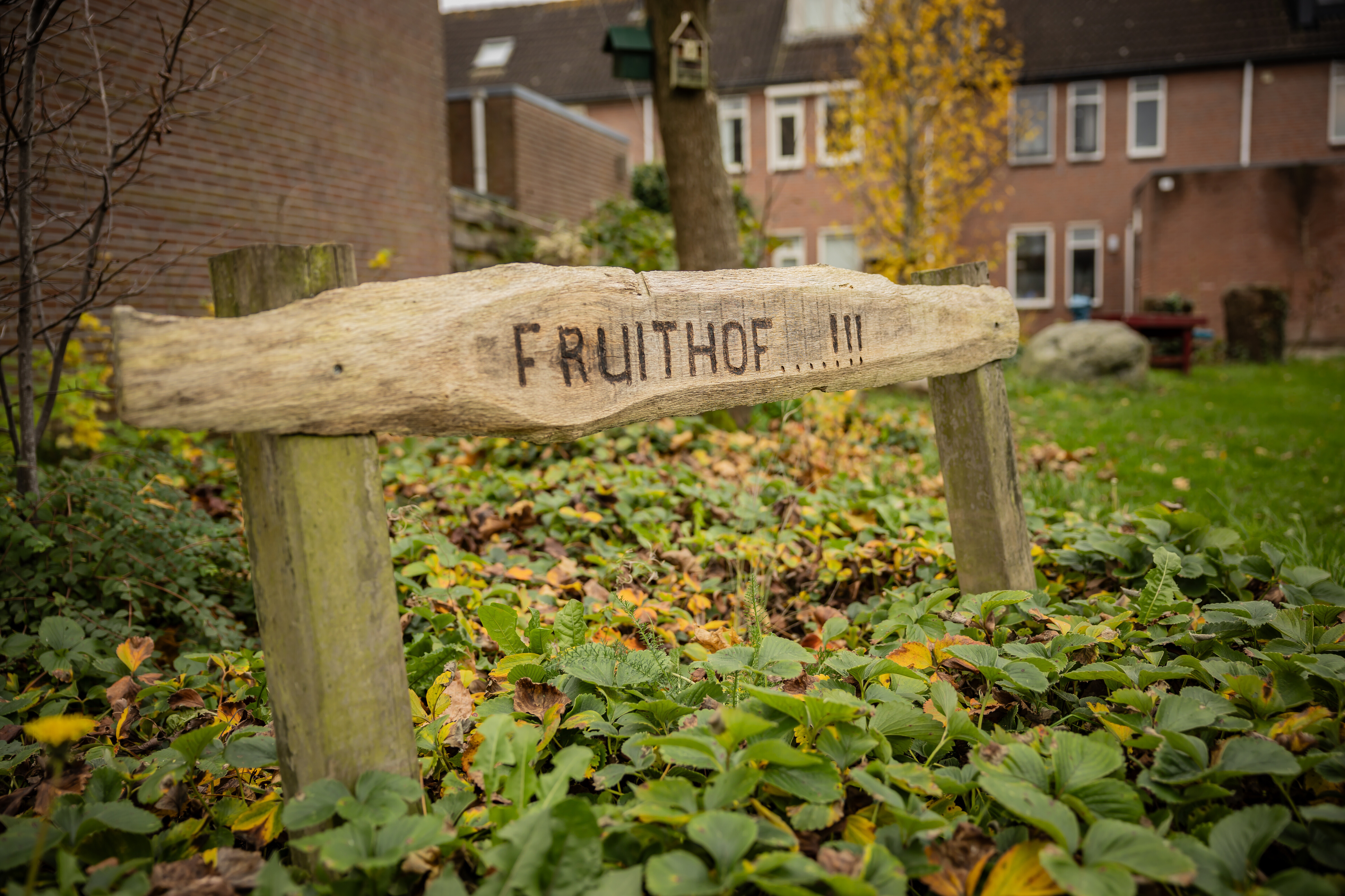 Zo is de ‘Fruithof’ ontstaan. Een levendige buurttuin waar aardbeien, druiven, bramen, pompoenen en kruiden groeien. De gemeente heeft nog een appel- en perenboom geplant ter compensatie van een zieke boom die weggehaald moest worden. Momenteel telt de Fruithof appgroep 33 leden, waarvan er naast Peter nog vier buurtbewoners wekelijks actief zijn. Ook nieuwe buren sluiten zich aan bij de groep, zo blijft de groep in beweging. Vanwege de droge zomer van drie jaar geleden is er een waterpomp geïnstalleerd zodat bewoners de planten bij droog weer voldoende water kunnen geven. Peter heeft naast de pomp een houten watertafel gemaakt zodat de kinderen kunnen spelen met zand en water.