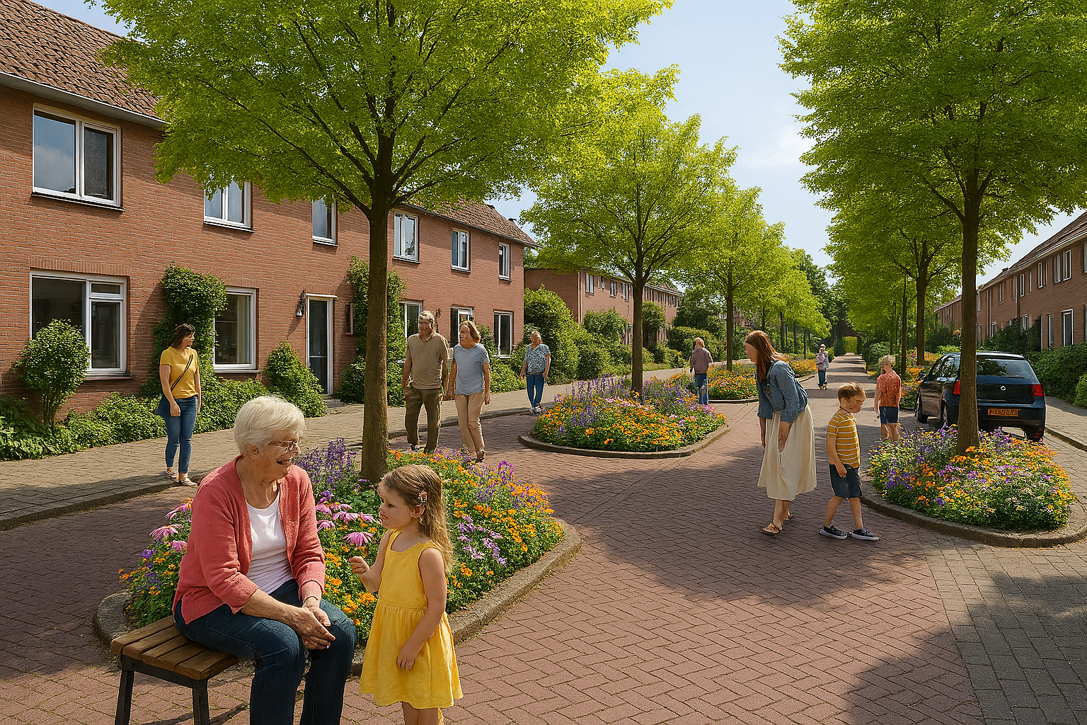 In 2026 wordt een gedeelte van de Carry van Bruggenstraat opnieuw ingericht door de gemeente met betrokkenheid van de inwoners. Dit draagt bij aan het langer vasthouden van water na regenbuien en klimaatadaptatie door het plaatsen van bomen voor meer schaduw. De bewoners kiezen voor bloemrijke bomen waar voedsel voor vogels en insecten te halen is dat bijdraagt aan meer biodiversiteit. De bewoners willen door middel van adoptietuinen de boomspiegels bloemrijk beplanten en hiermee de stenen vervangen voor bloemrijke tuintjes. Bewoners, van oud tot jong genieten van de tuintjes. De peuters en kleuters in de straat kunnen zo een bloem plukken en thuis in een vaas zetten of de insecten van dichtbij bekijken. En de wandelaars op de stoepen, jong en oud, lopen met meer vrolijkheid door de straat. Bewoners parkeren hun auto tussen de gezellig ogende tuintjes en de buren geven de planten water, houden het onkruid bij en treffen elkaar meer op straat. Dit zorgt voor meer verbinding en leuke gesprekken. De bewoners willen de opening van de heringerichte straat feestelijk vieren. (afbeelding AI)