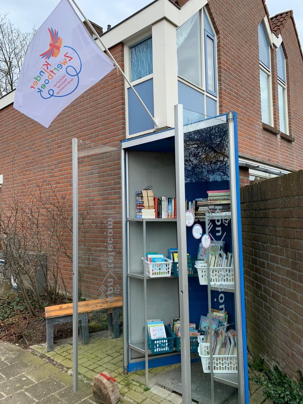 Plaatsen zerfboeken bibliotheek op de hoek van de Vrouwenlaan en de Bep Wiersmstraat.